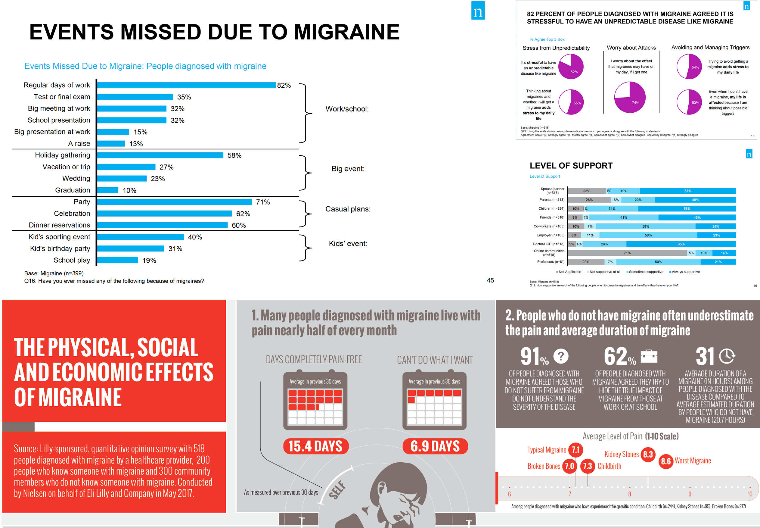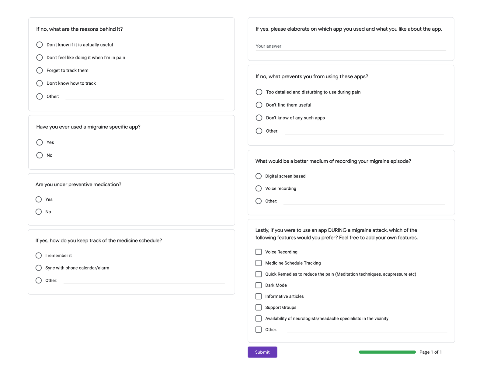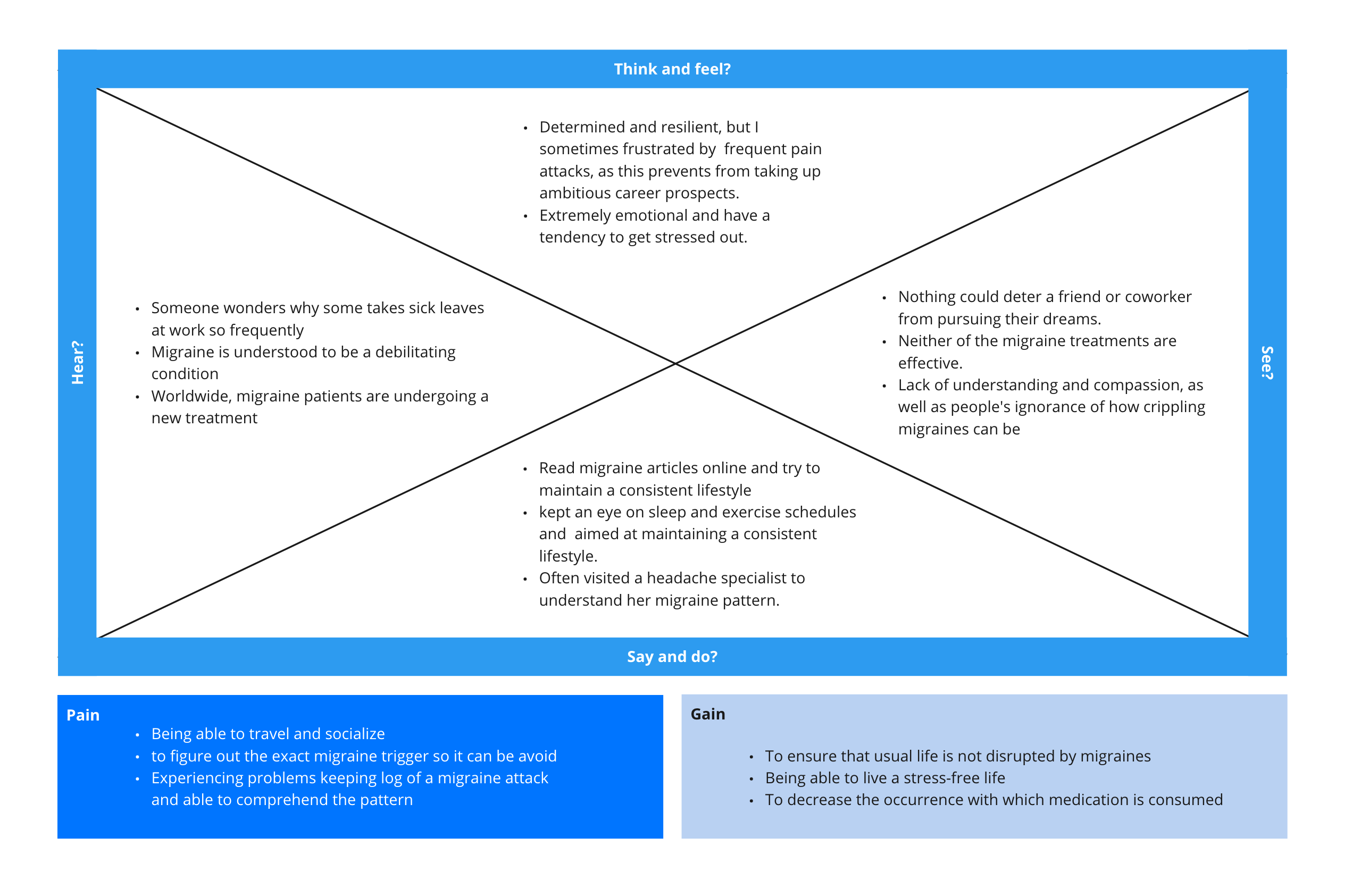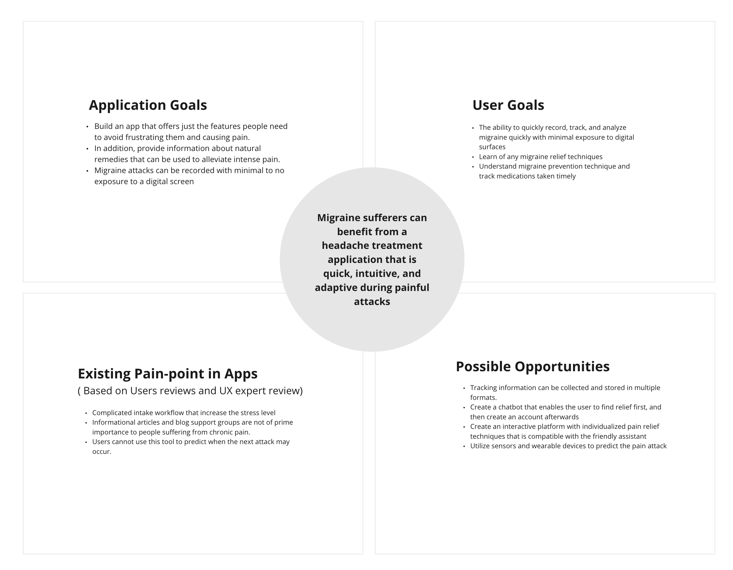 I started by building the fundamentals to define a meaningful and actionable human-centered problem statement, broad enough for creative freedom and narrow enough to make it manageable. Use of three main sources: hard-copy, digital, and social media and migraine blogs